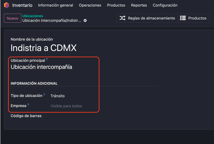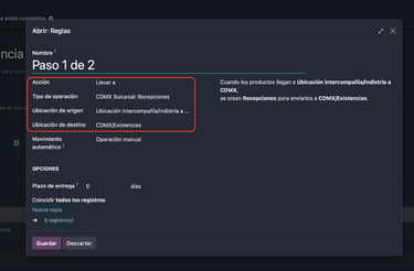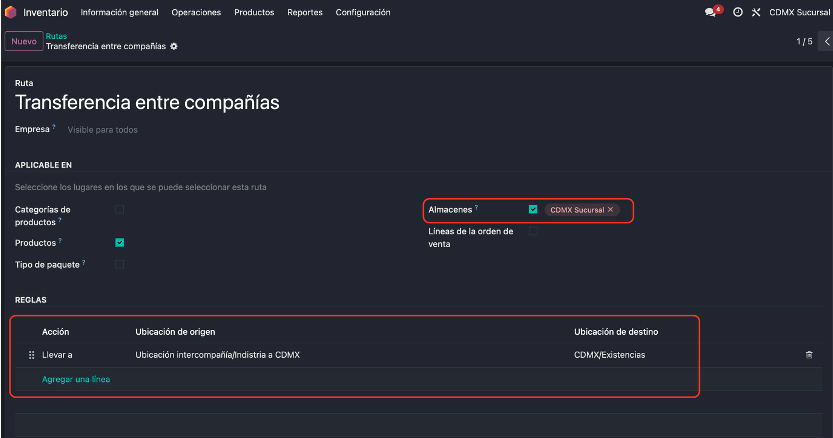 Dentro de esta ruta, vamos a crear una regla de inventario en la que indicaremos que, cuando un producto llegue a la ubicación de tránsito, Odoo deberá moverlo automáticamente a la ubicación de existencias de la compañía CDMX.