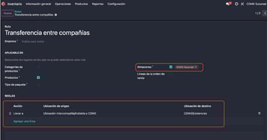 Con esta configuración, cada vez que el producto sea enviado a la ubicación de tránsito, Odoo ejecutará automáticamente el traslado hacia el almacén de la compañía receptora.