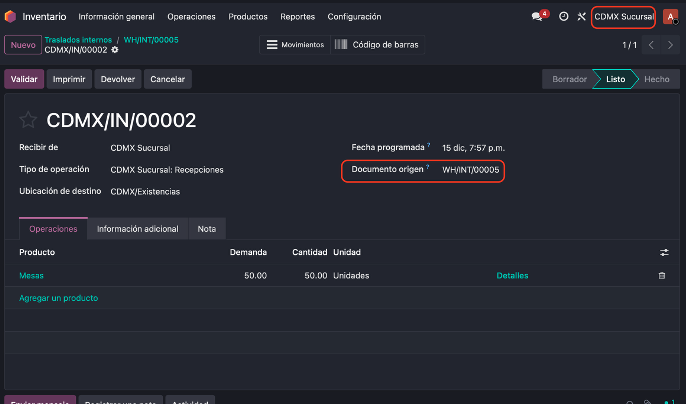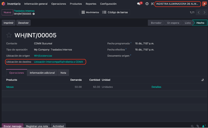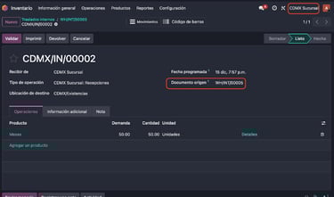 Sin embargo, si activamos la vista de múltiples compañías o cambiamos a la compañía CDMX, podremos observar que Odoo generó automáticamente un nuevo movimiento de inventario.