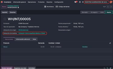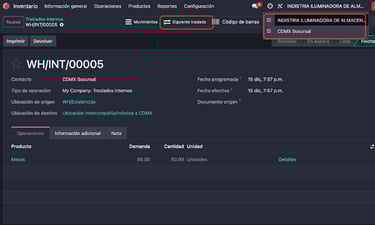 Para probar la configuración, únicamente debemos crear un traslado interno en la compañía Industria.