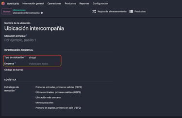 Lo primero que debemos hacer es crear una ubicación virtual sin compañía asignada. Para ello, vamos al módulo Inventario → Configuración → Ubicaciones y creamos una nueva ubicación de tipo Virtual. Esta ubicación funcionará como un punto neutral dentro del sistema.