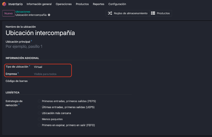 Posteriormente, creamos una ubicación de tránsito, también sin compañía, y definimos como ubicación principal la ubicación virtual creada en el paso anterior.